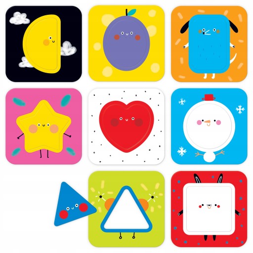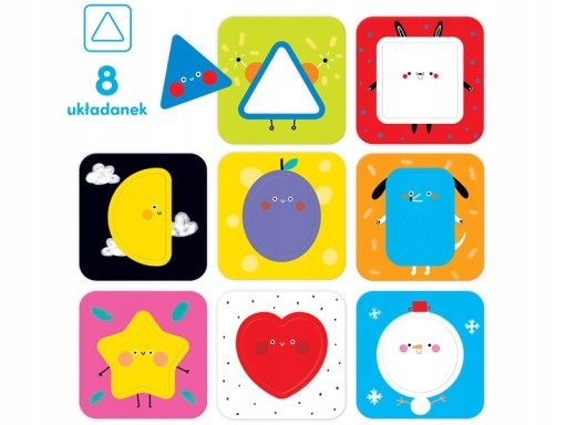 Składa się 8 dużych dwuelementowych układanek. Zabawa polega na dopasowywaniu wyjmowanych elementów o różnych kształtach do odpowiednich tabliczek.