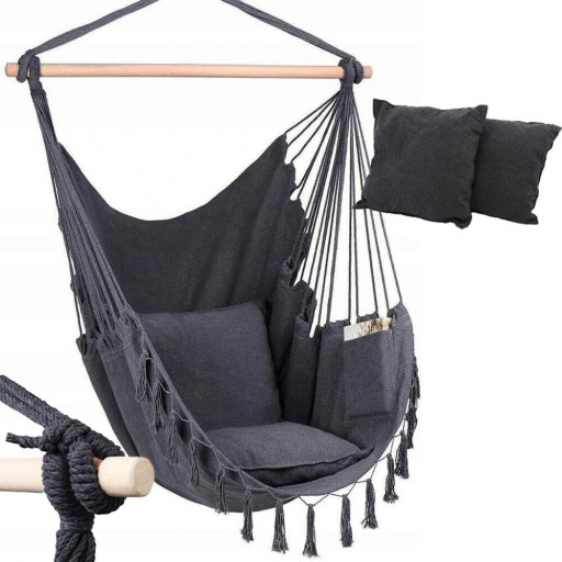 Konstrukcja fotela wieszanego została starannie zaprojektowana tak, aby zapewnić użytkownikowi maksymalny komfort i wygodę. Odpowiednio rozmieszczone liny zapewniają równomierne rozłożenie ciężaru ciała, co pozwala na idealne dopasowanie się fotela do kształtu ciała i odciążenie kręgosłupa. Dodatkowo, w zestawie znajdują się dwie poduszki, które jeszcze bardziej zwiększają komfort użytkowania, umożliwiając Państwu wypoczynek w idealnej pozycji.