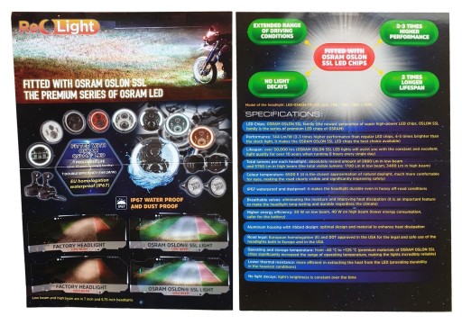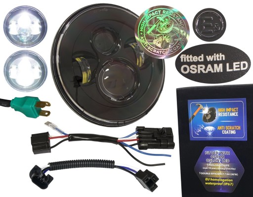 - w skład wchodzą: 1 lampa z LED-ami firmy OSRAM (z serii premium OSLON SSL), wtyczka H4, adapter H4-H13, adapter Harley Touring (2014-2021)