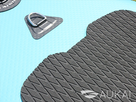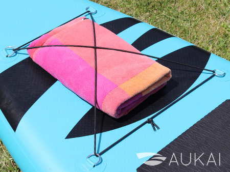 Na płycie znajdują się również 9 oczek montażowych, w tym 4 z przodu, 4 środkowe i 1 przymocowane z tyłu, które umożliwiają dołączenie różnych akcesoriów na desce. Elastyczny pasek bagażowy wciągnięty na przednim końcu ułatwia przenoszenie prostych rzeczy, takich jak ręczniki, napoje lub małe rzeczy na wodzie. Dzięki specjalnej powłoce płyta jest odporna na promieniowanie UV, a także odporna na chlor i słoną wodę. Kolory pozostają więc nawet po kilku latach.