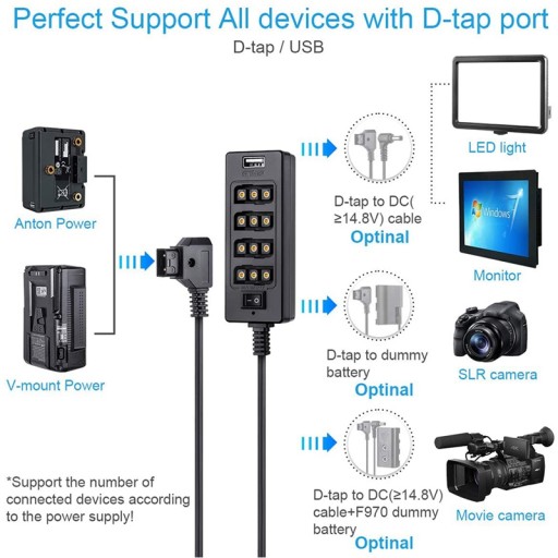 Kabel splittera Dtap z wyłącznik zasilania d-tap do zamka V V, złoty akumulator do portu żeńskiego 3P x 4 i portu USB Ten kabel splittera dtap służy do rozszerzenia interfejsu dtap mocy fotograficznej i akumulatora Anton Bauer/v-mount.Dzięki temu gniazdowi zasilania możesz rozszerzyć dowolne zasilanie, aby pomieścić do czterech oddzielnych, idealnych do zasilania wielu odbiorników bezprzewodowych, monitorów pokładowych, a także ultralekkich baterii pojedyncza kamera.Wtyczka A: d-tap złącze męskie, wtyczka B: 4 portu D-dotknij złącze żeńskie, wtyczka C: USB 5V/2.1A. Zaprojektowany z portem 3x4, dtap można szybko podłączyć do gniazda, nawet gdy oczy są zamknięte, co może zapobiec zablokowaniu urządzenia przez przewód zasilający.Kabel spiralny 4.33 cala do 39.3 cala, maksymalny prąd: 10a. USB dla twojego smartfona i innych urządzeń usb.Numer modelu: d-tap 1 dla 5Rozmiar: rozciągający się do 100cmMateriał: tworzywo sztuczne + MetalKolor: czarnyZawartość opakowania:1 x danych dotyczących szczepionki Dtap kabel splitteraTylko powyższa zawartość opakowania, inne produkty nie są uwzględnione.Uwaga: fotografowanie światłem i różne wyświetlacze mogą spowodować, że kolor przedmiotu na zdjęciu będzie trochę inny niż rzeczywisty. Błąd pomiaru wynosi +/- 1-3cm.