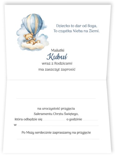 wewnątrz zaproszenia znajduje się wykropkowane miejsce do samodzielnego uzupełnienia