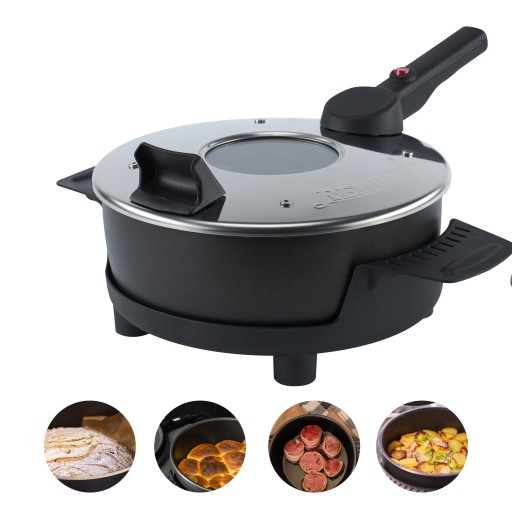 Remoska TRIA (3,5 l) – garnek z trójwarstwową nieprzywierającą powierzchnią z ceramicznym wzmocnieniem i elektryczną pokrywą do pieczenia, szklaną pokrywką do gotowania na wszystkich typach kuchenek, w tym indukcyjnych, oraz pokrywką z miękkim ciśnieniem do duszenia pod niewielkim ciśnieniem.