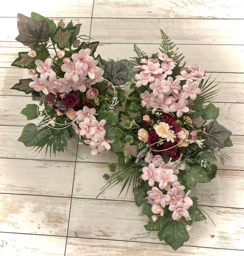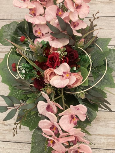Przedmiotem sprzedaży jest efektowna wiązanka ze sztucznych, dobrej jakości kwiatów, w obciążonej misie w komplecie z wkładem do wazonu idealnie pasującego do głównego stroika.