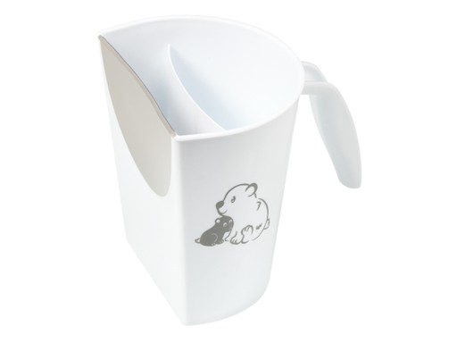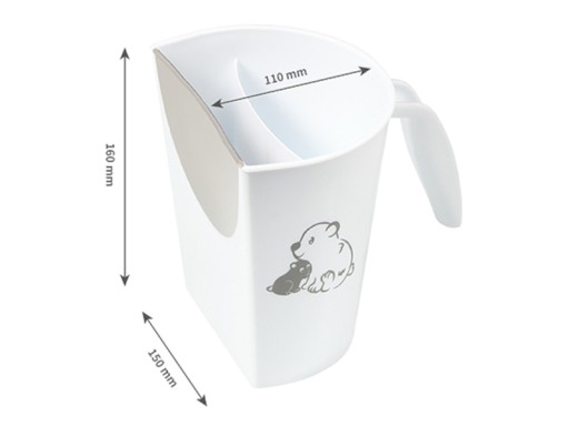 - funkcjonalna konstrukcja - aby zapewnić dokładniejsze spłukiwanie włosów, nasz kubek ma wyprofilowaną przegrodę, która dzieli go na dwie komory. Komora przednia służy do spłukiwania włosów z boku głowy. Komora tylna do spłukiwania górnej i tylnej części głowy dziecka. Woda wypływa w tym samym czasie, dzięki czemu płukanie trwa bardzo krótko
