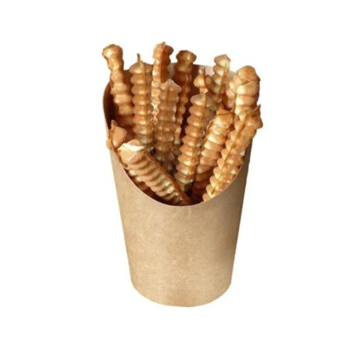 Wykonany z wysokiej jakości papieru kubek z podcięciem idealnie sprawdza się do serwowania gofrów bąbelkowych, frytek, tortilli. Eco styl papieru uwydatnia atrakcyjność serwowanych przekąsek i deserów.