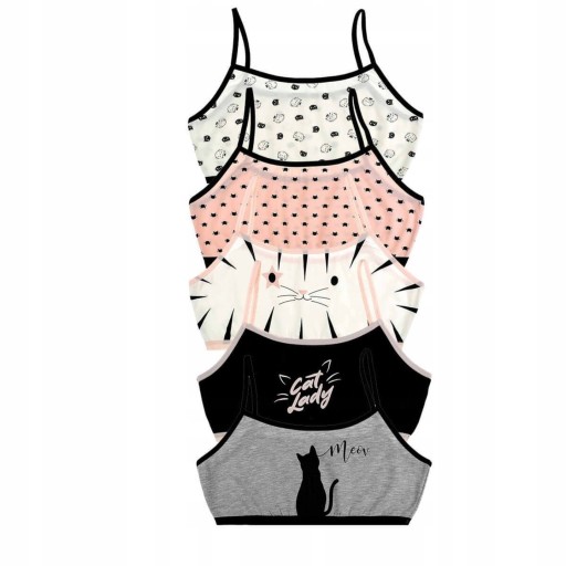 Śliczny zestaw 5 sztuk biustonoszy dziecięcych z nadrukowanym motywem kotka. W zestawie staniczki w kolorze białym, szarym różowym i czarnym. Oferowane produkty przez LILLY BLING są świetnej jakości. Bielizna wykonana z wysoko gatunkowej bawełny, miękka, praktyczna, niecisnąca! Idealna na zajęcia sportowe jak również na co dzień.