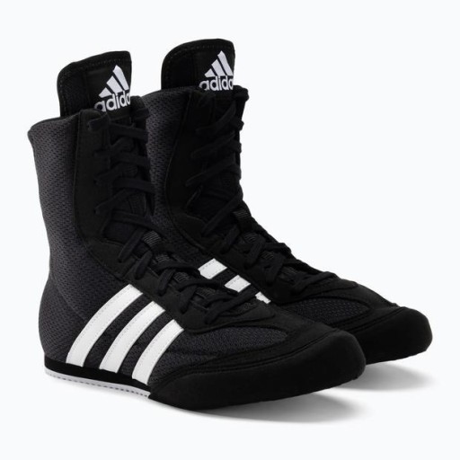 Buty bokserskie Adidas Box Hog 2 to lekki model, wykonany z wysokiej jakości materiałów, posiadający trwałą podeszwę. Mają czarny kolor z charakterystycznymi, białymi pionowymi paskami marki. W najnowszej generacji tego modelu nie ma logo adidas na pięcie. Buty Adidas Box Hog 2 zostały wykonane z wytrzymałej, jednowarstwowej siateczki nylonowej. Aby zapewnić maksymalny komfort, wkładka buta jest wypełniona elastyczną pianką EVA. Zastosowano również system wentylacji stopy, który skutecznie odprowadza nadmiar wilgoci. Obrzeża butów zostały wzmocnione syntetycznym zamszem typu Masch, co zapewnia im wyjątkową trwałość. Buty wyróżniają się doskonałą przyczepnością dzięki gumie użytej na zewnętrznej części podeszwy. Model butów Box Hog 2 jest dedykowany dla wszystkich sportowców, bez względu na ich doświadczenie. Są idealne dla bokserów przygotowujących się do zawodów i walk o medale. Zapewniają najwyższy komfort i wygodę nawet podczas intensywnych treningów. Doskonałe wykonanie, świetny design i najwyższa jakość materiałów sprawiają, że są to jedne z najpopularniejszych butów wybieranych przez bokserów.