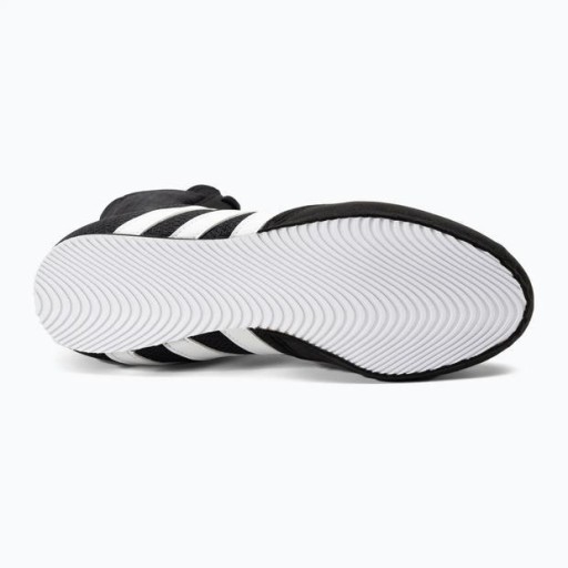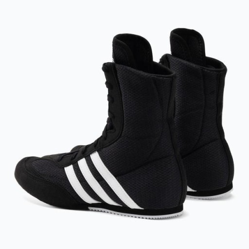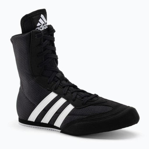 Buty bokserskie Adidas Box Hog 2 to lekki model, wykonany z wysokiej jakości materiałów, posiadający trwałą podeszwę. Mają czarny kolor z charakterystycznymi, białymi pionowymi paskami marki. W najnowszej generacji tego modelu nie ma logo adidas na pięcie. Buty Adidas Box Hog 2 zostały wykonane z wytrzymałej, jednowarstwowej siateczki nylonowej. Aby zapewnić maksymalny komfort, wkładka buta jest wypełniona elastyczną pianką EVA. Zastosowano również system wentylacji stopy, który skutecznie odprowadza nadmiar wilgoci. Obrzeża butów zostały wzmocnione syntetycznym zamszem typu Masch, co zapewnia im wyjątkową trwałość. Buty wyróżniają się doskonałą przyczepnością dzięki gumie użytej na zewnętrznej części podeszwy. Model butów Box Hog 2 jest dedykowany dla wszystkich sportowców, bez względu na ich doświadczenie. Są idealne dla bokserów przygotowujących się do zawodów i walk o medale. Zapewniają najwyższy komfort i wygodę nawet podczas intensywnych treningów. Doskonałe wykonanie, świetny design i najwyższa jakość materiałów sprawiają, że są to jedne z najpopularniejszych butów wybieranych przez bokserów.