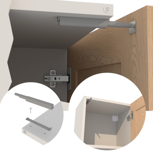 - Montaż odbojnika należy dokonać poprzez przykręcenie płytki do wewnętrznej części korpusu mebla. Następnie nakładamy mechanizm.