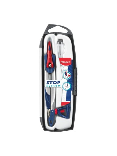 - Metalowy cyrkiel STOP SYSTEM z grafitową końcówką w plastikowym etui w zestawie z 2 elementami: uniwersalnym uchwytem na ołówek i zapasowym grafitem.