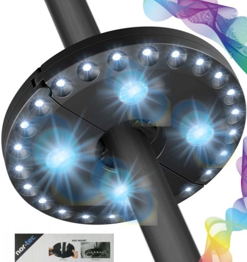 ŁATWOŚĆ MONTAŻU - lampę możemy zamontować na parasol lub drążek o średnicy od 25 do 48 mm. Dodatkowo posiada dwie zawieszki umożliwiające montaż na haczyku.
