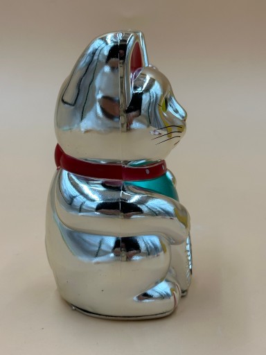 OPIS – kolor: srebrny, wymiary (szer/wys/grub): 10/13/8 cm, zasilanie: 1x bateria AA 1.5V (brak w zestawie), waga: 148 g, w zestawie: kot, kartonik, karteczka z chińskimi znakami. Kotki nie są wyposażone w wyłącznik , na wyposażeniu nie ma klapki zamykającej miejsce na baterię , bateria trzyma się dzięki sile sprężyny rozpierającej.