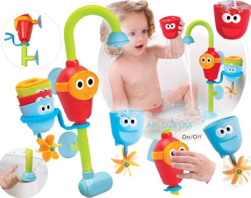 Zabawki do wody pozwalają maluszkowi przekonać się do kąpieli. Wesoły, kolorowy kranik zamontujemy na ściance wanny czy wanienki. Zielona rurka z prysznicową słuchawką, z której kapie woda, podłączona jest do wesołego stworka w goglach do nurkowania. Do zestawu dołączono cztery kolorowe, dziurawe kubeczki, przez które przecieka woda. Kubeczki można wsadzić jeden w drugi i włożyć do specjalnego uchwytu. Poniżej zamontowano żółtą, plastikową turbinkę, która obraca się pod wpływem wody. Chlapanie, pryskanie, przelewanie – kąpiel nigdy nie była fajniejsza! Dodatkowo, zabawka wspomaga rozwój dziecka – ćwiczy koordynację, umiejętności manualne, a także rozwija wyobraźnię i kreatywność.