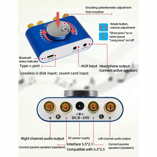 Opis: Materiał wysokiej klasy: Wykonany z najwyższej jakości aluminium i materiału ABS, ten mini bezprzewodowy wzmacniacz mocy jest trwały i praktyczny. Wiele wejść: Ten mini bezprzewodowy wzmacniacz mocy jest wyposażony w wiele wejść, w tym połączenie bezprzewodowe, pamięć flash i kartę dźwiękową. Szeroka kompatybilność: ten amplituner audio ma szerokie zastosowanie w laptopach, telefonach i komputerach. Kanały stereo: Ten amplituner jest wyposażony w dwa kanały stereo, które zapewniają dobre wrażenia muzyczne. Nie Hałas: ta płyta wzmacniacza działa cicho, co powoduje niewielkie hałasy. Specyfikacja: Kolor: jak pokazano. Materiał: aluminium, ABS. Rozmiar: około 7,7*5*2,9 cm/ 3,03*1,96*1,14 cala. Ilość kanałów: dwa kanały lewy i prawy (kanały stereo). Głośniki przystosowane: 0W-200W 4Ω, 8Ω, 16Ω. Napięcie zasilania: DC8-24V. Uwaga: Może wystąpić kilka zniekształceń kolorów spowodowanych różnymi rozdzielczościami komputera. Może wystąpić niewielki błąd spowodowany różnymi ręcznymi pomiarami ts. Pakiet zawiera: Jednoczęściowy mini bezprzewodowy wzmacniacz mocy.