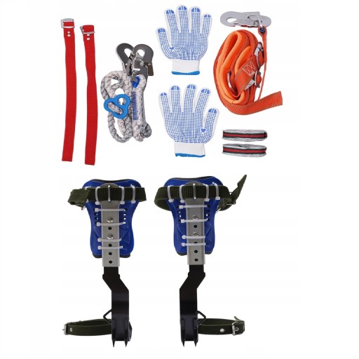 - Osłona bezpieczeństwa: narzędzie do wspinaczki jest wyposażone w dwa ostre i twarde stalowe pazury na każdym pedale, co wystarcza, aby zapewnić bezpieczne i skuteczne przebicie podczas wspinania się na drzewa, dzięki czemu można bardziej stabilnie nadepnąć na drzewa. Jednocześnie ochraniacze na nogi są mocowane za pomocą wielu szekli, aby zapewnić, że się nie zsuną. Zarówno pas bezpieczeństwa, jak i lina zabezpieczająca z hakiem o długości 2 m zapewniają wiele gwarancji użytkowania.