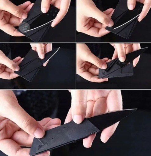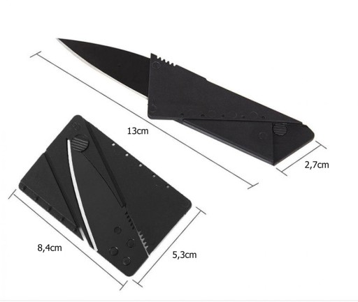 Lekki i cienki, a zarazem wytrzymały z ostrzem ze stali nierdzewnej.Pozostałe elementy karty wykonane z tworzywa sztucznego po złożeniu spinają się ze sobą i tworzą poręczną rękojeść. Taki właśnie jest kompaktowy nóż w kształcie karty kredytowej. Ten bardzo mały przedmiot jest szczególnie przydatny na wyjazdach, wycieczkach, obozach, campingach lub np. w samochodzie.