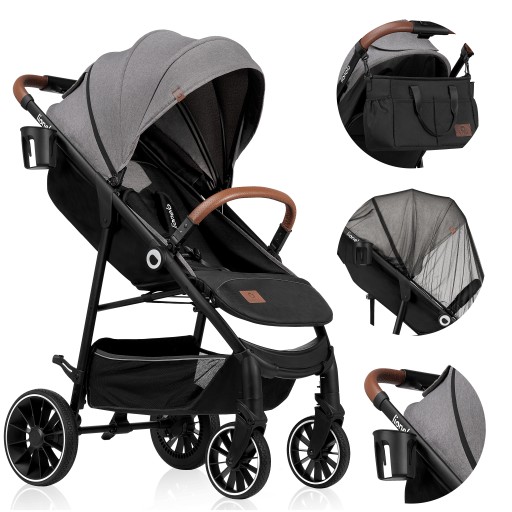 - Bogaty zestaw dodatków – torba, moskitiera, uchwyt na kubek, pokrowiec na spacerówkę