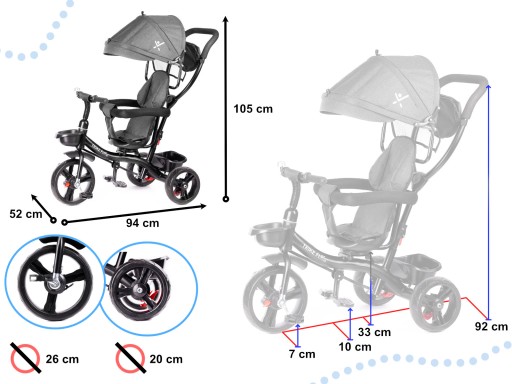 Wymiary rowerka (największa wysokość x długość x szerokość): 105cm x 94cm x 52cm