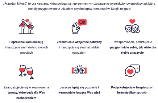 Dla osób, które stresują się pierwszą randką (karty to 450 najróżniejszych tematów do rozmów i 40 zabawnych wyzwań, które przełamią pierwsze lody) i tych, którzy chcieliby zadać drugiej osobie ciekawe, ważne i kluczowe dla relacji pytania, w taki sposób, aby NIE DAŁO się skłamać.