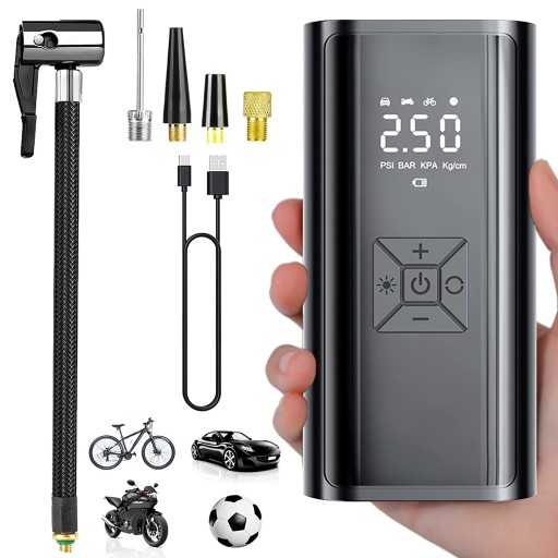 🚴♂️【3 jednostki ciśnienia powietrza i 4 tryby użytkowania】: Ta elektryczna pompa powietrza obsługuje 3 jednostki napięcia (bar, Kpa), ma cztery tryby pracy, obsługuje pompowanie piłek, opon rowerowych, opon motocyklowych i opon samochodowych.