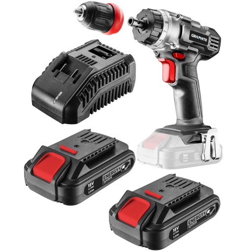 Wiertarko-wkrętarka współpracująca z akumulatorami 18V Li-Ion GRAPHITE Energy+. Elektronarzędzie posiada płynną regulację prędkości obrotowej oraz przełącznik kierunku obrotów. Samozaciskowy uchwyt pozwala na stosowanie osprzętu o średnicy 0.8 - 10 mm. Uchwyt jest zdejmowany, a pod nim znajduje się gniazdo sześciokątne 1/4”. Maksymalna prędkość obrotowa wrzeciona na pierwszym biegu wynosi 350, a na drugim 1250 obrotów na minutę. Maksymalny moment obrotowy wynosi 28 Nm (wkręcanie miękkie) / 44 Nm (twarde) i może być regulowany poprzez 19-stopniowe sprzęgło z dodatkową opcją wiercenia. Urządzenie wyposażono w elektryczny hamulec silnika i automatyczną blokadę wrzeciona. Uruchamiana automatycznie dioda LED podświetla miejsce pracy. Ergonomiczny kształt rękojeści i zwarta konstrukcja wiertarko-wkrętarki pozwalają na wygodną pracę także w trudnych warunkach. Rękojeść została pokryta materiałem antypoślizgowym, dzięki czemu elektronarzędzie pewnie leży w dłoni. Przekładnia planetarna została wykonana z wysokogatunkowej stali.