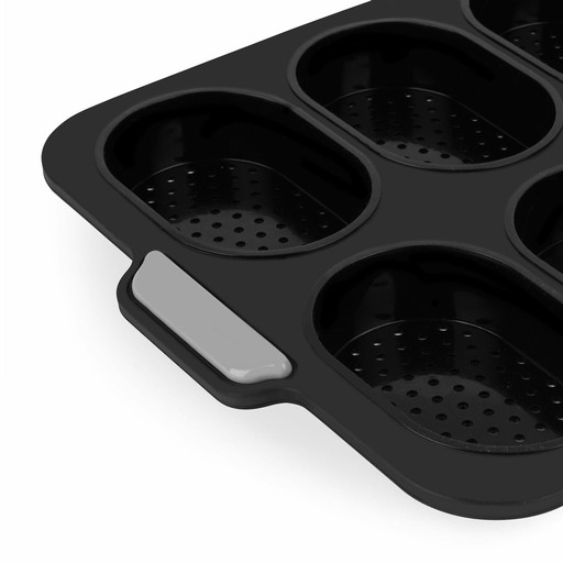 Perforacja zapewnia optymalną cyrkulację powietrza i temperaturę. Bułki będą wyjątkowo chrupiące i równomiernie wypieczone. Uchwyty foremki gwarantują wygodne wyjmowanie jej z rozgrzanego piekarnika.