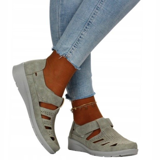 Półbuty damskie z wycięciami w kolorze szarym na niskim koturnie. Idealne na ciepłe dni. Sprawdzą się jako obuwie codzienne lub do pracy. Zapięcie na rzep ułatwia zakładanie. Wykonane z dobrych jakościowo materiałów. Komfortowa, miękka skórzana wkładka zapewnia komfort użytkowania. Prosty fason łatwo dopasuje się do wielu stylizacji.