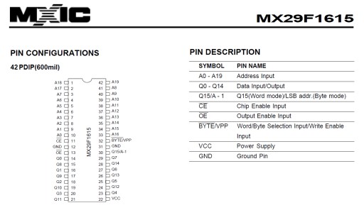 MX29F1615PC-10 -pamięć flash, równoległa o organizacji 8/16-bit i pojemności 2MB = 16 megabit (2048K x 8bit / 1024K x 16bit) 100ns - produkcji Macronix (MXIC) w obudowie PDIP42 (DIL).