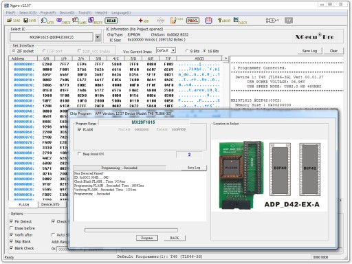 Lub tańszym popularnym modelem XGecu T48 (dostępnym na aukcji nr 12438102229) z dedykowanym adapterem ADP_D42_EX-A dostępnym w wersji z podstawką standardową (aukcja 12923300093) lub ZIF (aukcja 12923040068)