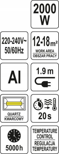 Promiennik podczerwieni Yato świetnie sprawdzi się jako ogrzewanie miejsca pracy lub odpoczynku w czasie chłodnych dni i nocy. Wyposażony w szybko nagrzewającą się lampę kwarcową jest w stanie ocieplić około 12-18m2 powierzchni. Zestaw montażowy umożliwia zamontowanie promiennika na ścianie, suficie oraz stojaku marki Yato (YT-99570, YT-99571). Dodatkowym atutem jest regulacja temperatury, którą można dostosować do panujących warunków pogodowych.