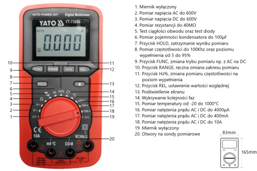 *Miernik YT-73086 nie posiada funkcji pomiaru true rms, dlatego powyższy wynik to realna wartość skuteczna napięcia AC tylko dla prawidłowego przebiegu sinusoidalnego.