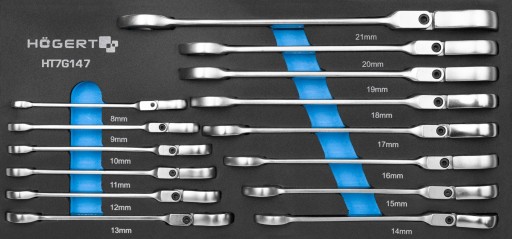 Klucze płasko-oczkowe z przegubem: HT1R048 (8 mm), HT1R049 (9 mm), HT1R050 (10 mm), HT1R051 (11 mm), HT1R052 (12 mm), HT1R053 (13 mm), HT1R054 (14 mm), HT1R055 (15 mm), HT1R056 (16 mm), HT1R057 (17 mm), HT1R058 (18 mm), HT1R059 (19 mm), HT1R060 (20 mm), HT1R061 (21 mm).