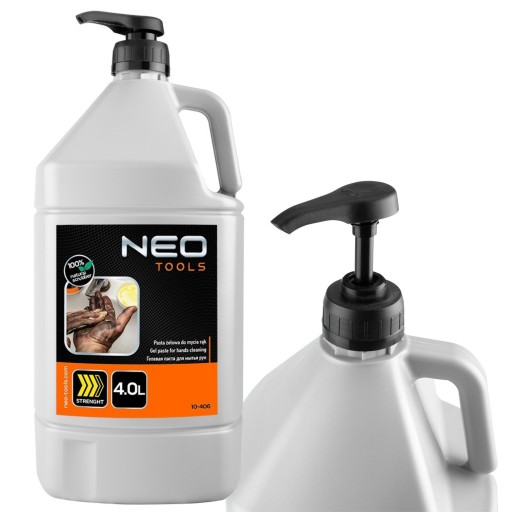 Żelowa, żółta, pasta do mycia rąk, do usuwania trudnych i bardzo trudnych zabrudzeń - butelka 4 litry z pompką NEO (nr ref. 10-406) poradzi sobie z zabrudzeniami, którym nie da rady mydło. Przeznaczona dla fachowców pracujących w budownictwie, motoryzacji, poligrafii, lakiernictwie. Pozwala zmyć zabrudzenia po specjalistycznych klejach, żywicy, silikonie, lakierach, farbach, piankach poliuretanowych oraz polimerach. Skuteczność pasty opiera się na naturalnym ścierniwie z krzemionki, które jest ekologiczne. Posiada naturalne pH dla skóry. Butelka o pojemności 4 L posiada pompkę dozującą.