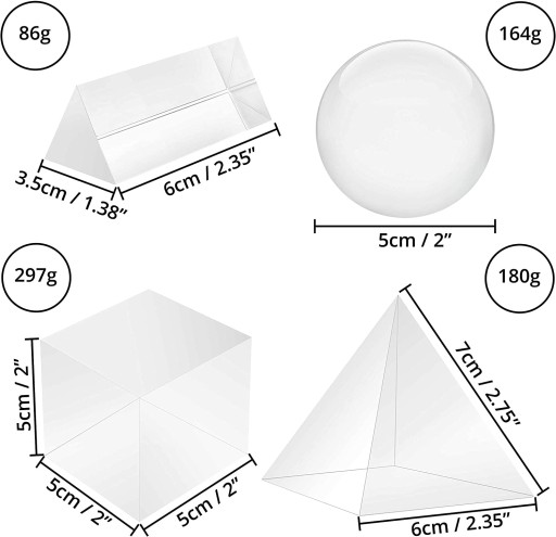 - Pryzmat piramida: wysokość 7 x szerokość 6 cm, waga 180 g.
