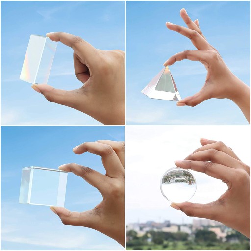 ⭐ PIĘKNA GAMA BARW: Zestaw zawiera pryzmaty w kształcie trójkąta i piramidy. Za pomocą naszych pryzmatów możesz rozszczepić wiązkę światła, co spowoduje pojawienie się na twojej ścianie wszystkich kolorów tęczy. Pryzmaty będą idealne do zrobienia ciekawych efektów przy robieniu zdjęć lub uczenia dzieci o świetle. Pryzmaty zostały zrobione z przezroczystego kryształy K9. Dokładne wymiary znajdują się na dołączonej grafice.
