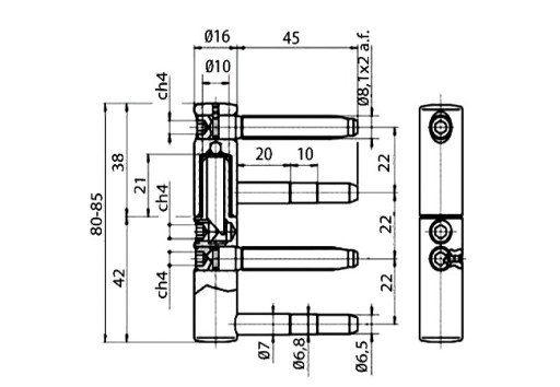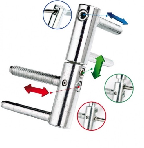 Zawias wkręcany z regulacją w trzech płaszczyznach, której dokonuje się za pomocą jednego klucza, bez konieczności demontażu drzwi. Teflonowa wkładka w górnej części zawiasu chroni przed wycieraniem się materiału, a łożyskowane śruby gwarantują precyzyjną regulację. Konstrukcja trzpieni umożliwia stabilne i pewne osadzenie zawiasu.