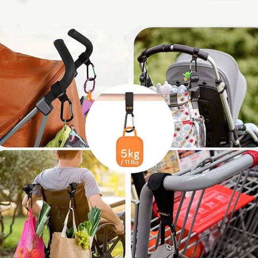 - Praktyczne haczyki umożliwiają zawieszenie toreb, siatek, zabawek itp na rączce wózka