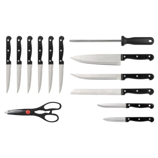 Zestaw składa się z jedenastu noży o różnej długości i przeznaczeniu oraz uniwersalnych nożyc, które sprawdzą się w wielu sytuacjach podczas gotowania.