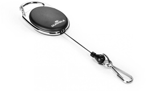 Stylowy owalny mechanizm ściągający z metalowym zaczepem do spodni i karabińczykiem.