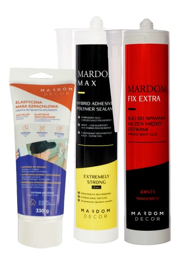 - Listwy sufitowe i ścienne należy skutecznie połączyć klejem do łączeń Mardom Fix Extra . Miejsca na które nakładany będzie klej muszą być suche i odpylone. Łączenia uzupełniamy i szpachlujemy Elastyczną Masą Szpachlową.