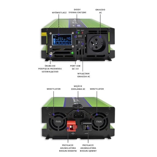 Obudowa zaprojektowana została z wysokiej jakości aluminium odpornej na wstrząsy oraz uszkodzenia mechaniczne. To idealny wybór dla osób lubiących długie podróże. Dzięki przetwornicy z wbudowanym gniazdem sieciowym możesz korzystać z prawie każdego urządzenia wymagającego podłączenia do gniazdka. Wyposażony w wyświetlacz LCD , który monitoruje wszystkie najważniejsze parametry urządzenia. Dodatkowo produkt posiada port USB do ładowania urządzeń mobilnych i wentylator dbający o odpowiednie chłodzenie .