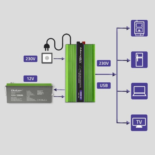 - Przetwornicy napięcia 12V na 230V, po podłączeniu akumulatora przetwornica pobiera potrzebną energię do zasilenia podłączonego urządzenia,