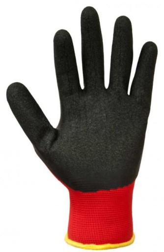 ✅ Rękawice ochronne, wykonane z dzianiny poliestrowej w kolorze czerwonym, powlekane lateksem w kolorze czarnym, bezszwowe, zakończone ściągaczem.