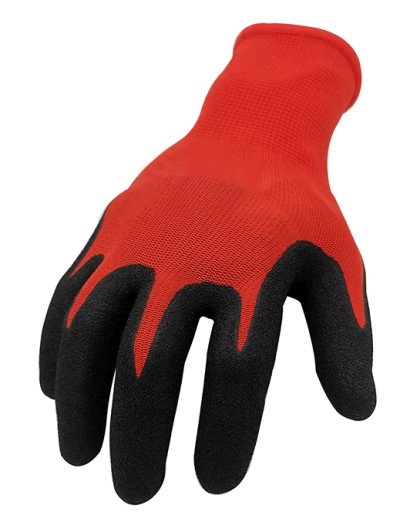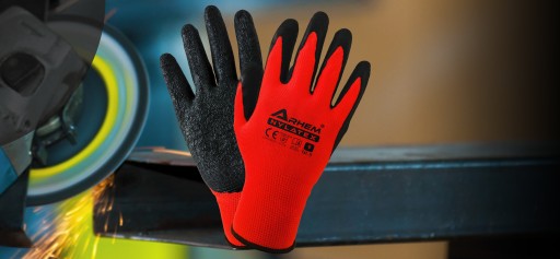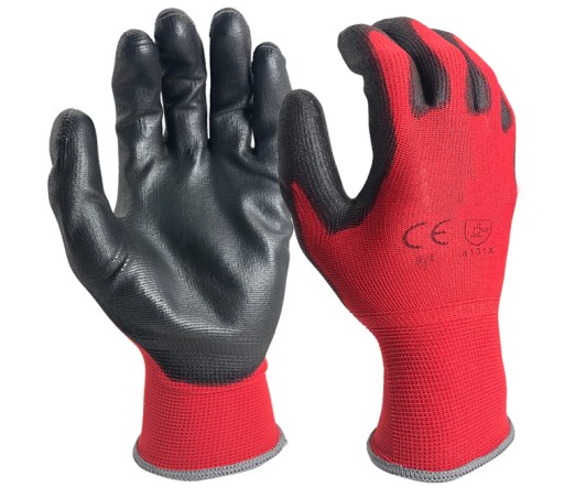 ✅ Rękawice ochronne, wykonane z dzianiny poliestrowej w kolorze czerwonym, powlekane lateksem w kolorze czarnym, bezszwowe, zakończone ściągaczem.