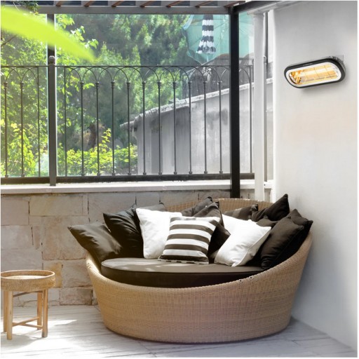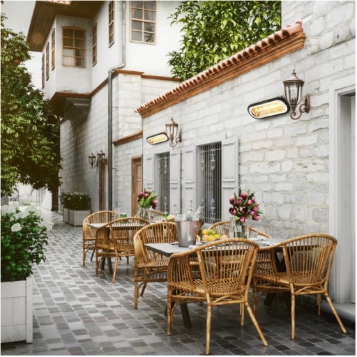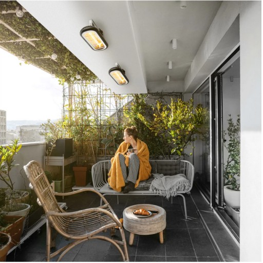 2 w 1 - ścienny i sufitowy promiennik podczerwieni o niskim współczynniku odbicia światła (2000 W) dla letnich temperatur na zewnątrz dzięki ochronie IP65 odpornej na warunki atmosferyczne.