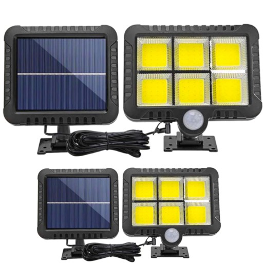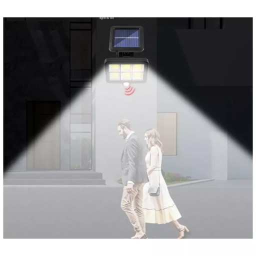 Lampa solarna ścienna 160 led COB z 3 trybami pracy, posiada pilota zdalnego sterowania oraz czujnik ruchu i zmierzchu, IP65 jest wodoodporna. Lampa słoneczna idealna przed dom, do oświetlenia drzwi wejściowych, furtki, ściany domu itp. Moduły led COB mają znacznie lepszą wydajność w porównaniu do tradycyjnych diod.