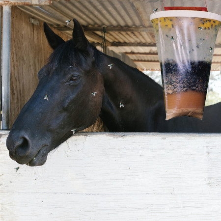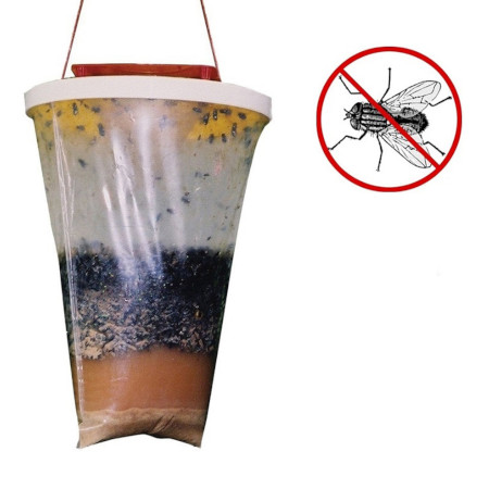 ✅ Pułapkę zawiesza się na zewnątrz pomiędzy źródłem nalotu much, a budynkami w odległości nie mniejszej niż 15 metrów od budynków.