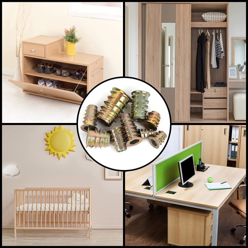Łatwy montaż, wystarczy wywiercić otwór o odpowiednim rozmiarze i zainstalować za pomocą klucza sześciokątnego. Wkładki wkręcane nadają się do miękkiego drewna sosnowego, sklejki, płyt pilśniowych itp., doskonale sprawdzają się na kombinacji mebli.