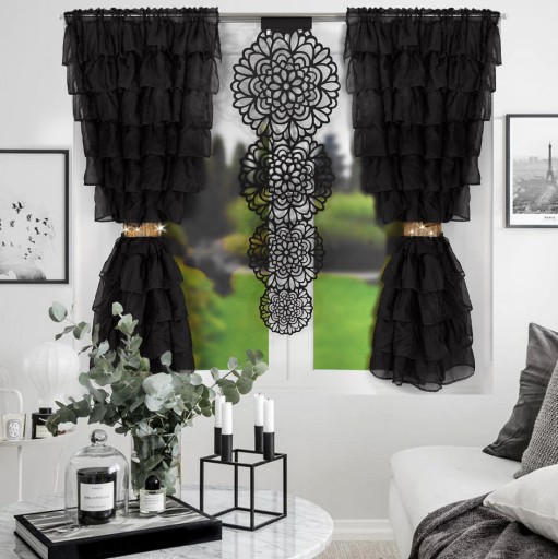 Elegancki zestaw składa się z panelu ażurowego oraz 2 firan dekoracyjnych. Panel wykonany został z grubego, sztywnego filcu, który nie ulega odkształceniom.
